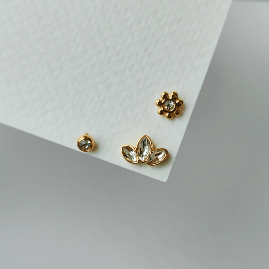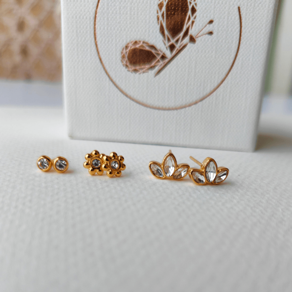 डिम्पलरी द्वारा प्रस्तुत 3 इयररिंग सेट - सेमी फ्लावर ज़िरकोनिया, जिसमें तीन खूबसूरत इयररिंग हैं: एक सफ़ेद पत्थर का स्टड, सफ़ेद पत्थरों से जड़ा तीन पंखुड़ियों वाला एक फूल स्टड, और सफ़ेद पत्थर से जड़ा एक छोटा सा सोने का फूल स्टड। फूलों के प्रेमियों के लिए बिल्कुल सही, ये इयररिंग रोज़ाना पहनने के लिए डिज़ाइन किए गए हैं, जो आपके लुक में चार चाँद लगा देंगे। 18 कैरेट सोने की परत से बने, ये त्वचा के अनुकूल, दाग-धब्बों से बचाने वाले और वाटरप्रूफ हैं, जो स्थायी सुंदरता और टिकाऊपन सुनिश्चित करते हैं। डिम्पलरी में, हम सभी महिलाओं के लिए विलासिता को सुलभ और किफ़ायती बनाने के लिए प्रतिबद्ध हैं।