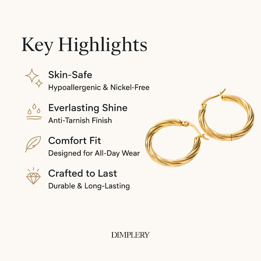 पेश हैं ट्विस्टी हूप इयररिंग्स, आपके ज्वेलरी कलेक्शन में एक स्टाइलिश और बहुमुखी जोड़। ये मोटे, ट्विस्टी-टेक्सचर्ड हूप इयररिंग्स तीन साइज़ में उपलब्ध हैं: 20 मिमी, 35 मिमी और 40 मिमी, जिससे आप किसी भी अवसर के लिए एकदम सही फिटिंग चुन सकते हैं। 18 कैरेट गोल्ड प्लेटिंग से बने, ये एंटी-टार्निश, वाटरप्रूफ और त्वचा के अनुकूल हैं, जो टिकाऊपन और आराम सुनिश्चित करते हैं।