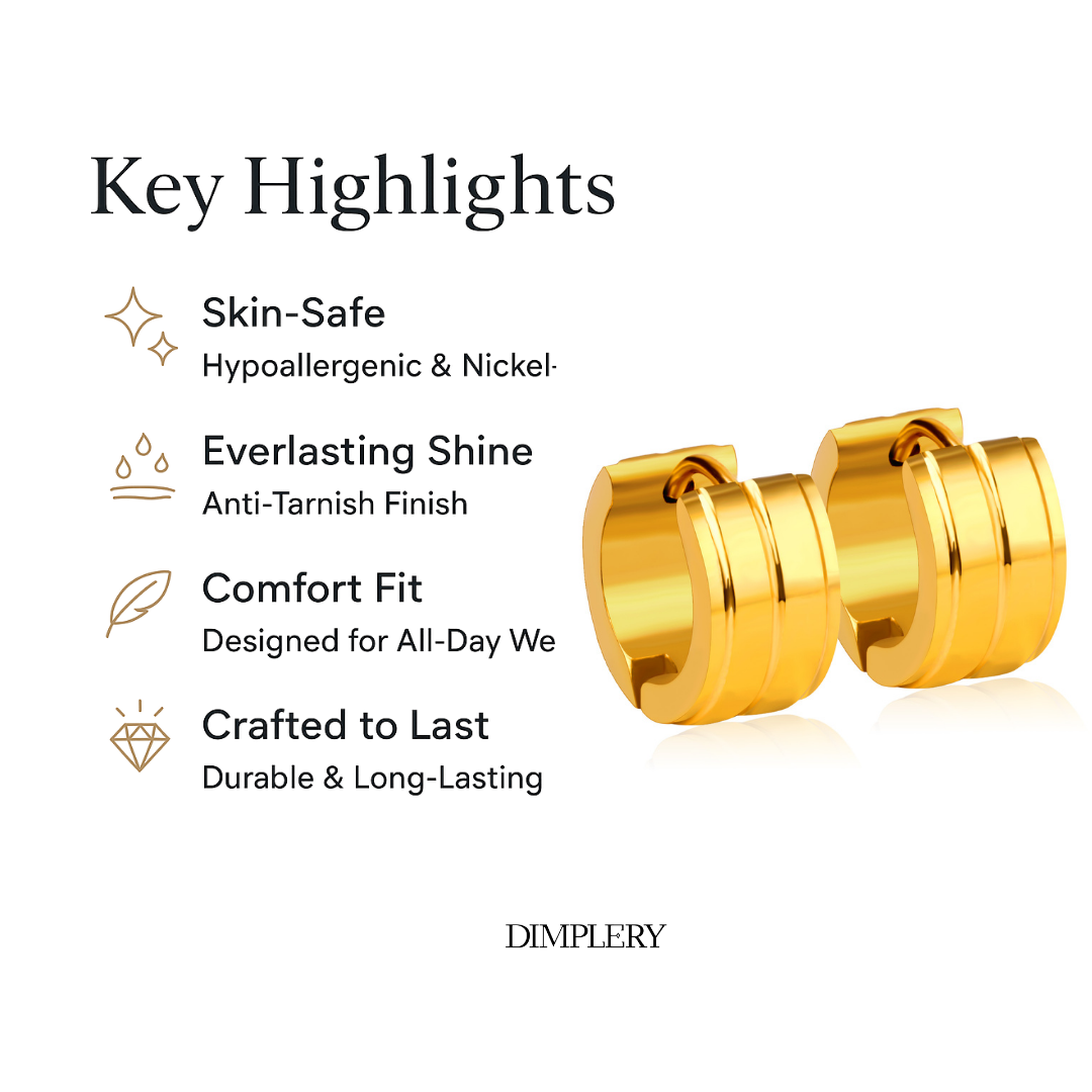 इन बकल हूप इयररिंग्स में 18 कैरेट सोने की शानदार प्लेटिंग है, जो टिकाऊपन और परिष्कृत स्टाइल का मेल है। वाटरप्रूफ, पसीने से सुरक्षित और दाग-धब्बों से मुक्त, ये लंबे समय तक चमक और आराम प्रदान करते हैं। हाइपोएलर्जेनिक और सोच-समझकर डिज़ाइन किए गए, ये सभी उम्र के पुरुषों के लिए एक आदर्श एक्सेसरी हैं जो एक परिष्कृत और कालातीत लुक चाहते हैं।