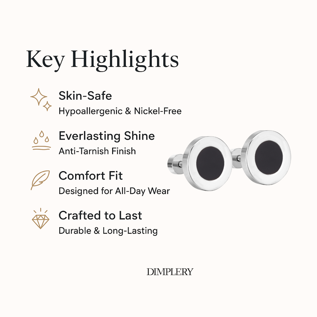 इन डिस्क ब्लैक स्टड इयररिंग्स में शानदार पॉलिश की हुई सिल्वर प्लेटिंग और सिल्वर टोन वाले उच्च-गुणवत्ता वाले स्टेनलेस स्टील बेस का इस्तेमाल किया गया है, जो एक परिष्कृत और स्थायी चमक प्रदान करते हैं। वाटरप्रूफ, स्वेटप्रूफ और दाग-धब्बों से सुरक्षित होने के कारण, ये रोज़ाना इस्तेमाल के बाद भी अपनी सुंदरता बनाए रखते हैं। हाइपोएलर्जेनिक और मुलायम स्क्रू बैक के साथ डिज़ाइन किए गए, ये बिना किसी जलन के आरामदायक और सुरक्षित फिट प्रदान करते हैं, जिससे ये महिलाओं, लड़कियों और दूसरी बार पियर्सिंग करवाने वालों के लिए उपयुक्त हैं।
