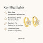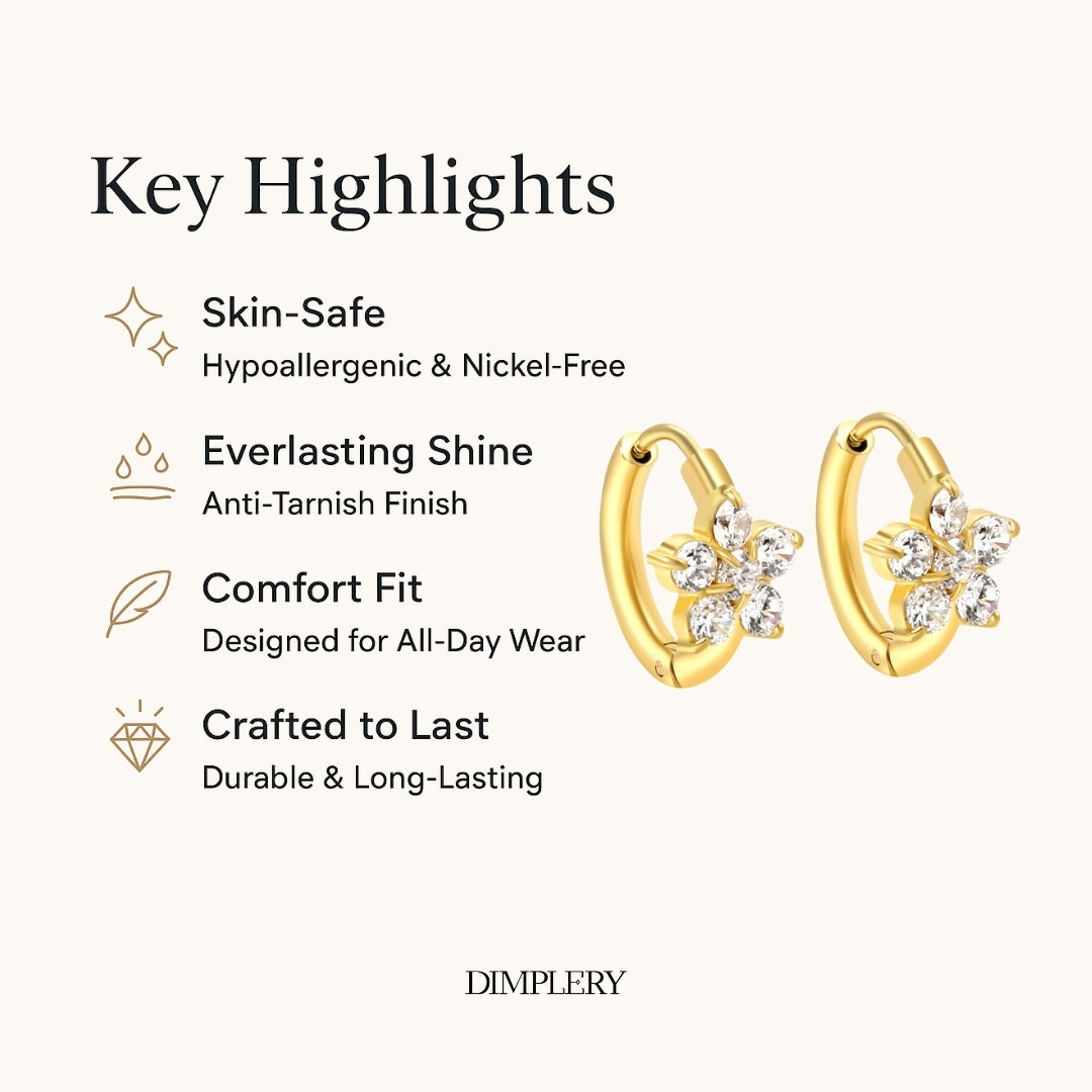 ये फ्लावर स्पार्कल मिनी हूप इयररिंग्स 18 कैरेट सोने की प्लेटिंग और सुनहरे रंग के उच्च-गुणवत्ता वाले स्टेनलेस स्टील बेस से सुसज्जित हैं, जो एक परिष्कृत और स्थायी चमक प्रदान करते हैं। वाटरप्रूफ, स्वेटप्रूफ और दाग-धब्बों से मुक्त होने के लिए डिज़ाइन किए गए, ये रोज़ाना इस्तेमाल के साथ अपनी सुंदरता बनाए रखते हैं। हाइपोएलर्जेनिक और मुलायम स्क्रू बैक के साथ डिज़ाइन किए गए, ये बिना किसी जलन के आरामदायक और सुरक्षित फिट प्रदान करते हैं, जिससे ये महिलाओं, लड़कियों और दूसरी बार पियर्सिंग करवाने वालों के लिए उपयुक्त हैं।