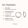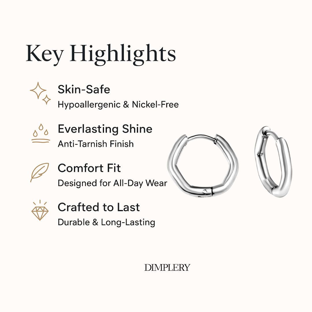 चांदी के ये हेक्सागोन हूप इयररिंग्स शानदार 18 कैरेट सोने की परत से सजे हैं जो पानी, पसीने और दाग-धब्बों से बचाते हैं, जिससे इनकी चमक लंबे समय तक बनी रहती है। हाइपोएलर्जेनिक और सोच-समझकर तैयार किए गए, ये हर उम्र की महिलाओं के लिए एक बेहतरीन एक्सेसरी हैं जो कालातीत सुंदरता और आराम की कद्र करती हैं।