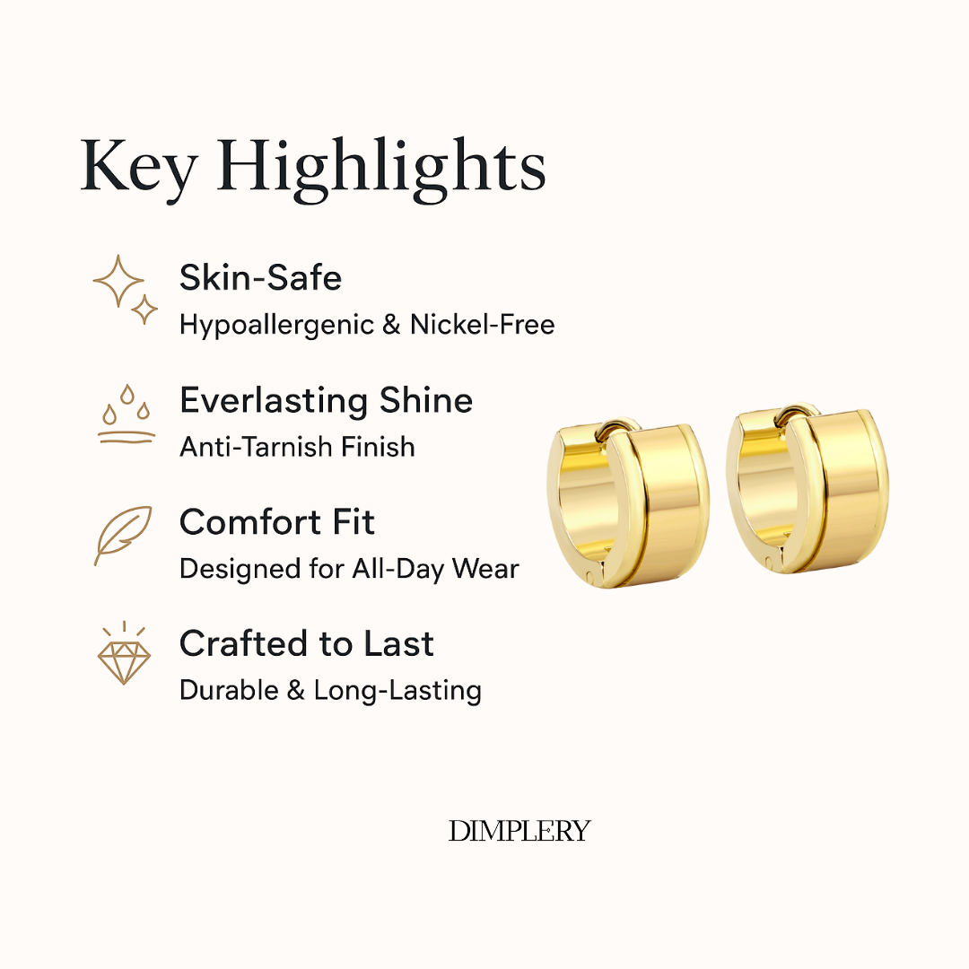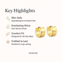 ये हूप हग्गी इयररिंग्स रोज़ाना इस्तेमाल में आसान बनाने के लिए विशेष रूप से डिज़ाइन किए गए हैं और इनमें चमकदार 18 कैरेट सोने की परत चढ़ी है। ये वाटरप्रूफ, पसीने से बचाने वाले और दाग-धब्बों से बचाने वाले हैं, और इन्हें किसी भी जीवनशैली के अनुकूल बनाया गया है। हाइपोएलर्जेनिक बनावट के साथ, ये पूरे दिन आरामदायक पहनने का अनुभव प्रदान करते हैं, जिससे ये सभी उम्र के पुरुषों के लिए एक भरोसेमंद और स्टाइलिश विकल्प बन जाते हैं—चाहे आप पहली बार कान छिदवा रहे हों या अपने कानों के कलेक्शन को नया रूप दे रहे हों।