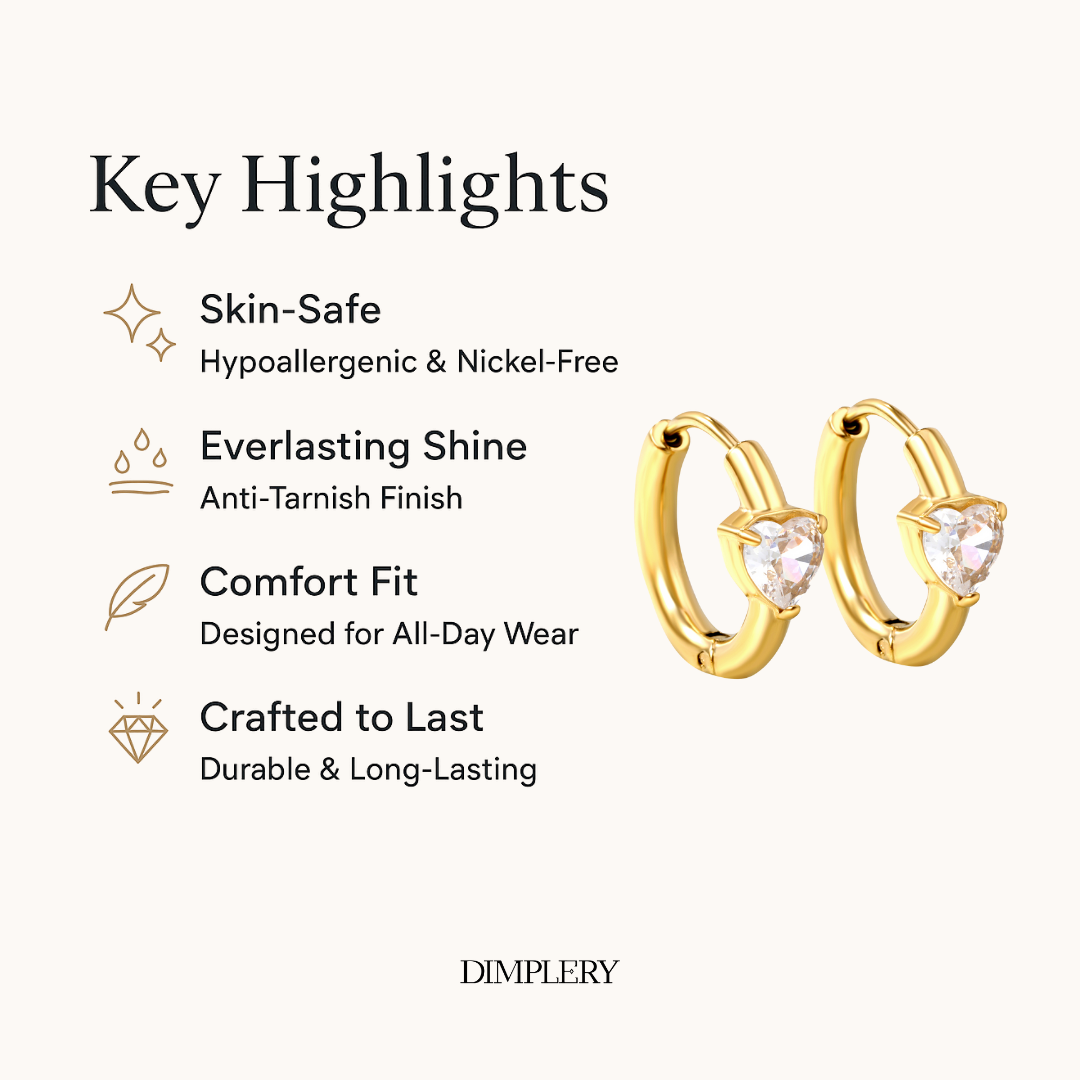 इन लव स्पार्कल मिनी हूप्स में 18 कैरेट सोने की खूबसूरत परत और सुनहरे रंग के उच्च-गुणवत्ता वाले स्टेनलेस स्टील बेस है, जो एक परिष्कृत और स्थायी चमक प्रदान करते हैं। वाटरप्रूफ, स्वेटप्रूफ और दाग-धब्बों से मुक्त होने के लिए डिज़ाइन किए गए, ये रोज़ाना इस्तेमाल के साथ अपनी सुंदरता बनाए रखते हैं। हाइपोएलर्जेनिक और मुलायम स्क्रू बैक के साथ डिज़ाइन किए गए, ये बिना किसी जलन के आरामदायक और सुरक्षित फिट प्रदान करते हैं, जिससे ये महिलाओं, लड़कियों और दूसरी बार पियर्सिंग करवाने वालों के लिए उपयुक्त हैं।