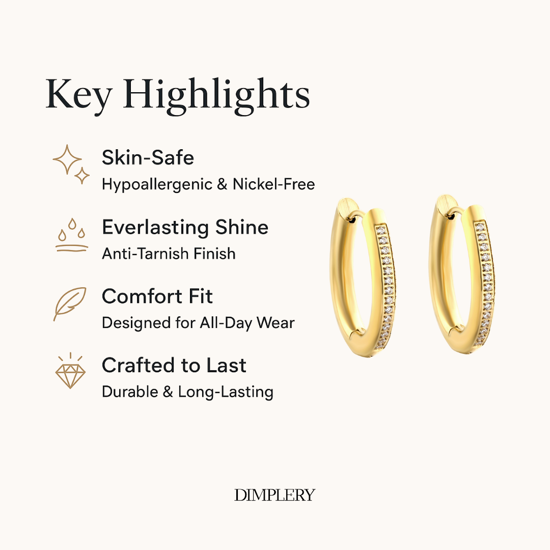 ओवेल ज़िरकोनिया हूप इयररिंग्स कालातीत डिज़ाइन और टिकाऊ कारीगरी का संगम हैं। 18 कैरेट सोने की परत वाले ये इयररिंग्स पानी, पसीने और दाग-धब्बों से सुरक्षित रहते हैं और अपनी खूबसूरत चमक बरकरार रखते हैं। हाइपोएलर्जेनिक और आरामदायक, ये हर उम्र की महिलाओं के लिए उपयुक्त हैं जो एक परिष्कृत एक्सेसरी की तलाश में हैं जो किसी भी लुक को निखारे।