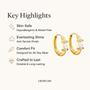 इन प्रिंसेस स्पार्कल मिनी हूप्स में 18 कैरेट सोने की खूबसूरत परत और सुनहरे रंग के उच्च-गुणवत्ता वाले स्टेनलेस स्टील बेस है, जो एक परिष्कृत और स्थायी चमक प्रदान करते हैं। वाटरप्रूफ, स्वेटप्रूफ और दाग-धब्बों से मुक्त होने के लिए डिज़ाइन किए गए, ये रोज़ाना इस्तेमाल के साथ अपनी सुंदरता बनाए रखते हैं। हाइपोएलर्जेनिक और मुलायम स्क्रू बैक के साथ डिज़ाइन किए गए, ये बिना किसी जलन के आरामदायक और सुरक्षित फिट प्रदान करते हैं, जिससे ये महिलाओं, लड़कियों और दूसरी बार पियर्सिंग करवाने वालों के लिए उपयुक्त हैं।