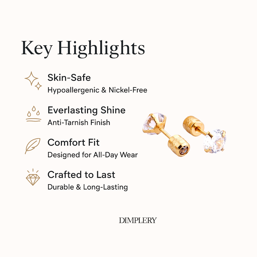 ये रिवर्सिबल डायमंड ट्विस्ट स्टड इयररिंग्स, दोनों तरफ़ हीरे जड़े हुए हैं और इनका गोल्ड टोन वाला, उच्च-गुणवत्ता वाला स्टेनलेस स्टील बेस है, जो इन्हें एक परिष्कृत और स्थायी चमक प्रदान करता है। वाटरप्रूफ, स्वेटप्रूफ़ और दाग-धब्बों से बचाने के लिए डिज़ाइन किए गए, ये रोज़ाना इस्तेमाल के साथ अपनी सुंदरता बनाए रखते हैं। हाइपोएलर्जेनिक और मुलायम स्क्रू बैक के साथ डिज़ाइन किए गए, ये बिना किसी जलन के आरामदायक और सुरक्षित फिट प्रदान करते हैं, जिससे ये महिलाओं, लड़कियों और दूसरी बार पियर्सिंग करवाने वालों के लिए उपयुक्त हैं।
