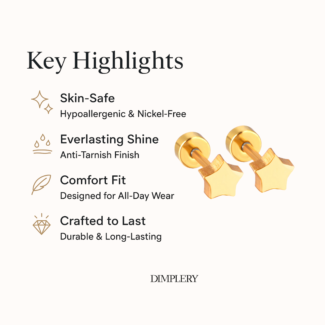 ये स्टार शेप इयररिंग्स 18 कैरेट गोल्ड प्लेटिंग से बने हैं जो इन्हें लंबे समय तक चमकाते हैं। वाटरप्रूफ, स्वेटप्रूफ और दाग-धब्बों से सुरक्षित, ये रोज़ाना पहनने के लिए एकदम सही हैं। हाइपोएलर्जेनिक और संवेदनशील त्वचा के लिए कोमल, ये इयररिंग्स हर उम्र की महिलाओं और बच्चों के लिए उपयुक्त हैं। मुलायम स्क्रू-टाइप बैकिंग के साथ, ये सुरक्षित और आरामदायक फिट प्रदान करते हैं, जिससे ये पूरे दिन पहनने के लिए एक स्टाइलिश और विश्वसनीय एक्सेसरी बन जाते हैं।