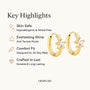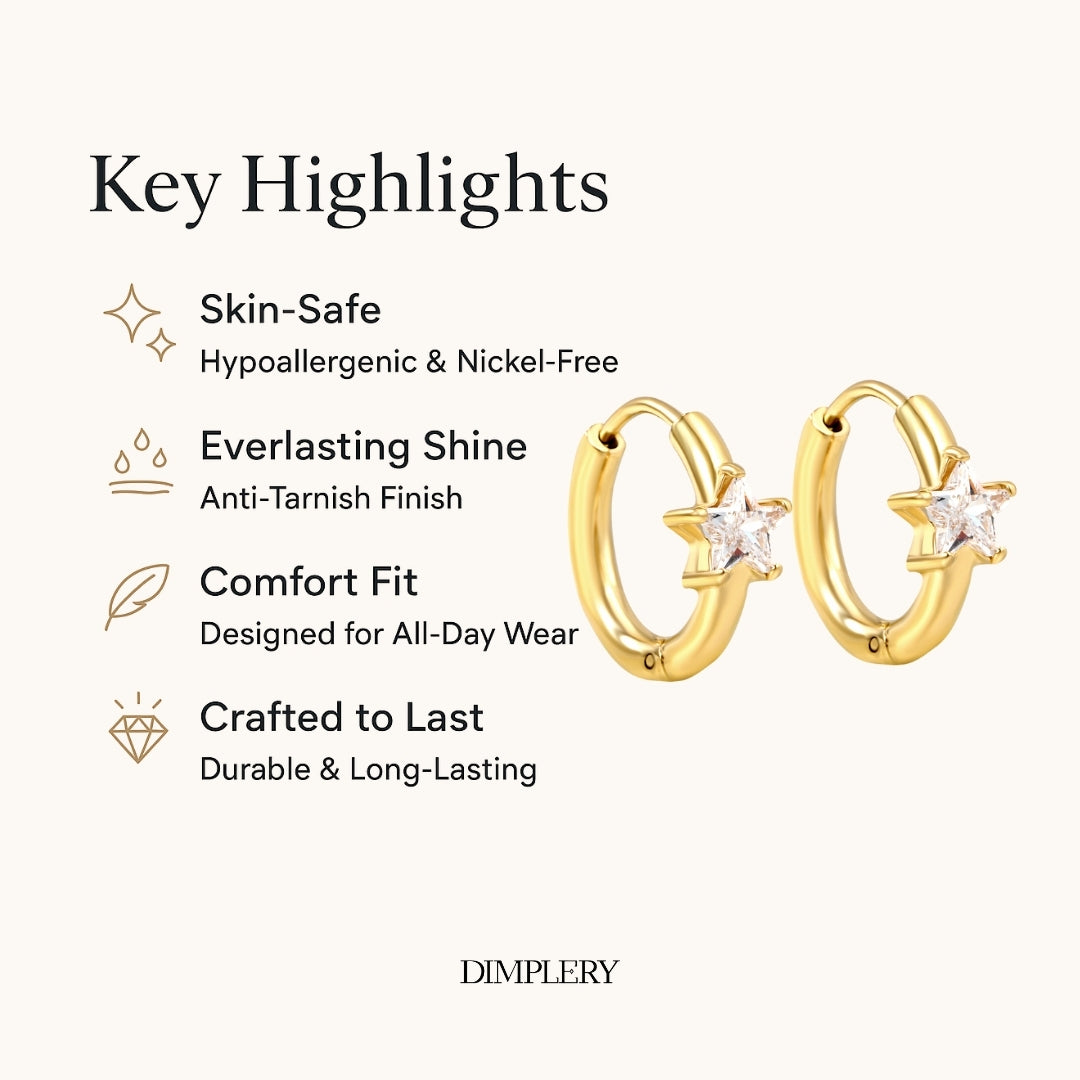ये स्टार स्पार्कल मिनी हूप इयररिंग्स 18 कैरेट सोने की प्लेटिंग और सुनहरे रंग के उच्च-गुणवत्ता वाले स्टेनलेस स्टील बेस से सुसज्जित हैं, जो एक परिष्कृत और स्थायी चमक प्रदान करते हैं। वाटरप्रूफ, स्वेटप्रूफ और दाग-धब्बों से मुक्त होने के लिए डिज़ाइन किए गए, ये रोज़ाना इस्तेमाल के साथ अपनी सुंदरता बनाए रखते हैं। हाइपोएलर्जेनिक और मुलायम स्क्रू बैक के साथ डिज़ाइन किए गए, ये बिना किसी जलन के आरामदायक और सुरक्षित फिट प्रदान करते हैं, जिससे ये महिलाओं, लड़कियों और दूसरी बार पियर्सिंग करवाने वालों के लिए उपयुक्त हैं।