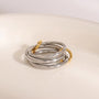 Transform your style with our Triple Dual Tone Ring! Featuring a dual tone triple layered design, this ring can be worn on 3 fingers for a bold look, or on a single finger for a classic touch. Made of high grade stainless steel, our interlocking silver and gold rings add a touch of sophistication to any outfit.