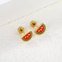 ये वाटरमेलन स्लाइस स्टड इयररिंग्स बच्चों के लिए डिज़ाइन किए गए हैं और इन पर 18 कैरेट सोने की परत चढ़ी है जो इन्हें लंबे समय तक चमकाती और टिकाऊ बनाती है। वाटरप्रूफ, पसीने से तर और दाग-धब्बों से सुरक्षित, ये रोज़ाना पहनने के लिए बिल्कुल सही हैं। हाइपोएलर्जेनिक और संवेदनशील त्वचा पर कोमल, ये इयररिंग्स आराम और सुरक्षा सुनिश्चित करते हैं। ट्विस्ट लॉक फ़ीचर अतिरिक्त सुरक्षा प्रदान करता है, जिससे आपके बच्चे की सभी गतिविधियों के दौरान इयररिंग्स अपनी जगह पर मज़बूती से टिके रहते हैं। डिम्पलरी में, हम सभी बच्चों के लिए विलासिता को सुलभ और किफ़ायती बनाने के लिए समर्पित हैं।
