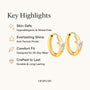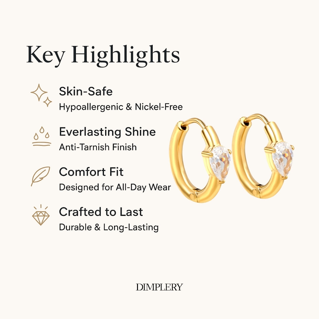 इन वाटर ड्रॉप स्पार्कल मिनी हूप्स में 18 कैरेट सोने की खूबसूरत परत और सुनहरे रंग के उच्च-गुणवत्ता वाले स्टेनलेस स्टील बेस है, जो एक परिष्कृत और स्थायी चमक प्रदान करते हैं। वाटरप्रूफ, स्वेटप्रूफ और दाग-धब्बों से मुक्त होने के लिए डिज़ाइन किए गए, ये रोज़ाना इस्तेमाल के साथ अपनी सुंदरता बनाए रखते हैं। हाइपोएलर्जेनिक और मुलायम स्क्रू बैक के साथ डिज़ाइन किए गए, ये बिना किसी जलन के आरामदायक और सुरक्षित फिट प्रदान करते हैं, जिससे ये महिलाओं, लड़कियों और दूसरी पियर्सिंग करवाने वालों के लिए उपयुक्त हैं।