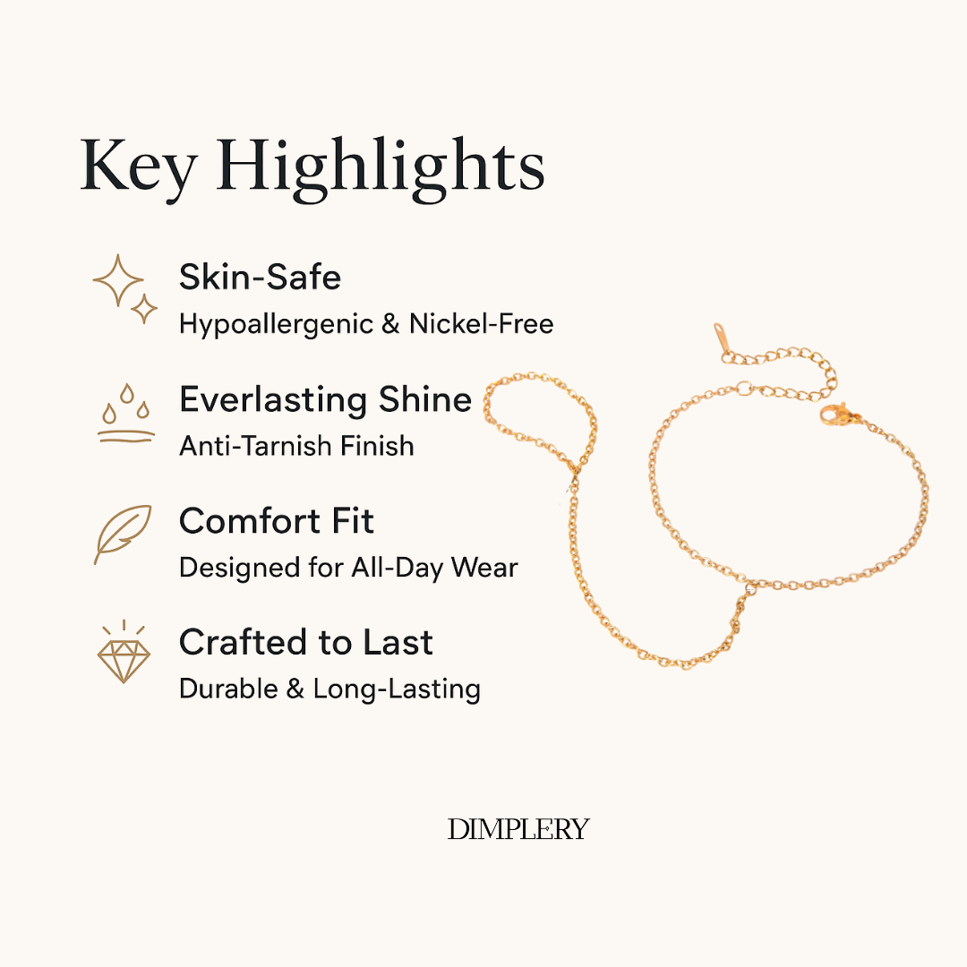 The Simple Hand Chain Bracelet, exquisitely 18k gold plated, combines durability with timeless elegance. Its waterproof, sweatproof, and anti-tarnish qualities ensure enduring beauty, while the hypoallergenic design provides comfort for women of all ages. This refined piece effortlessly enhances any ensemble, making it an essential accessory for sophisticated style.